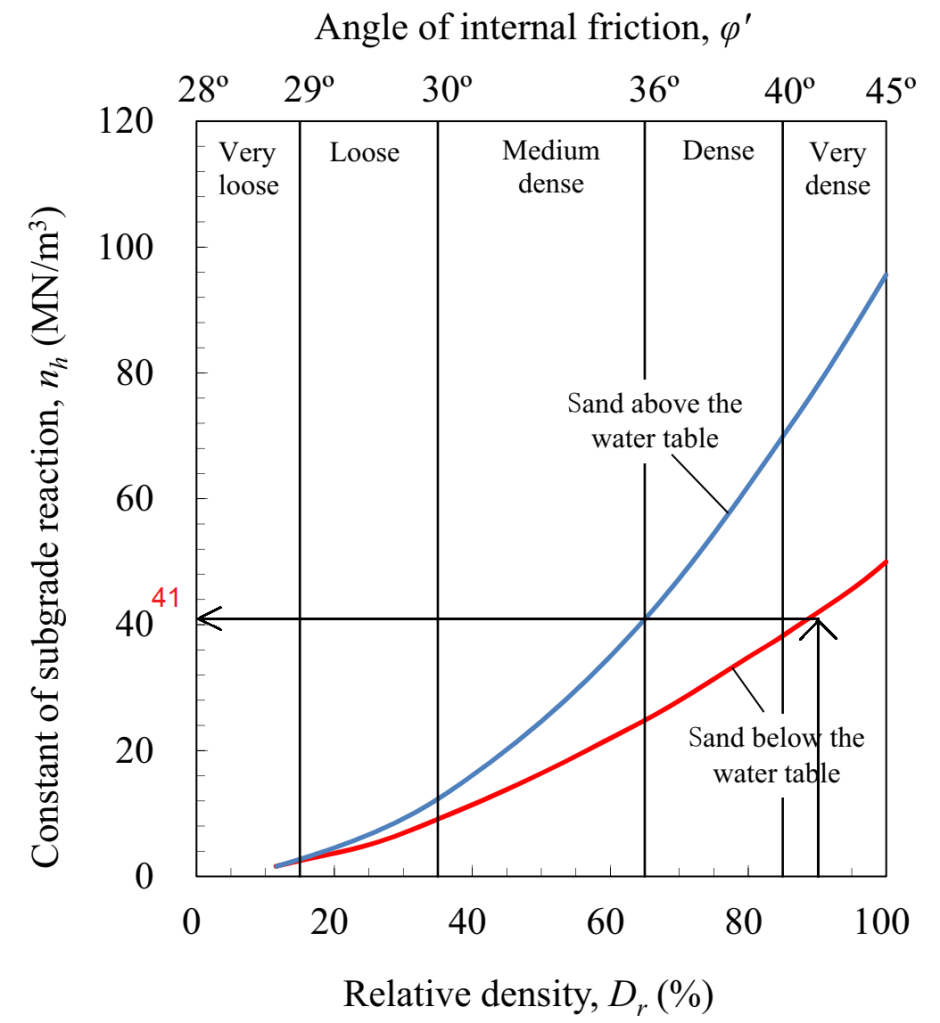 Dimana modulus subgrade tanah (nh) = 41 MN/m3; diperoleh dari hasil plot grafik hubungan kepadatan relative Dr = 90% dan modulus subgrade sebagai berikut.