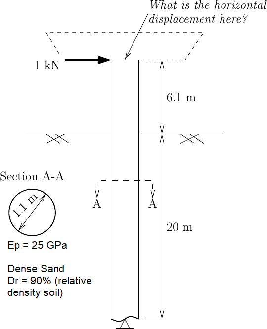 Diberikan kasus pilar-fondasi jembatan diberikan gaya horizontal P = 1 kN di puncaknya seperti gambar berikut.